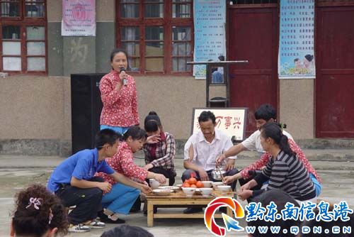 近年來,錦屏縣華寨村兩委充分思考農村生產生活、婚姻家庭等民間糾紛及村寨建設、村寨治理等農村社會管理方面的熱點、難點問題,積極探農村社會管理的新路子,通過召開村民代表大會民主制定《村民自治合約》來自我管理、自我約束,組建了勸和小組、調解小組、勸和文藝隊,對夫妻吵架制定了“家和萬事興”流動扁牌,勸和小組送扁牌進家吃勸和飯唱勸和歌化解矛盾,如今華寨村的勸和文藝隊,自編自演華寨通過《村民自治合約》模式管理下村里發生翻天覆地喜人變化的文藝節目,每逢重大節日和省內外的考察團來來參觀考察時,村兩委都要舉行文藝匯演,特別是形象逼真小品《勸和》、《計劃生育好處多》、《戒賭歌》等節目了反映華寨近年來在村民自治合約模制的管理下,全村男女平等、村民積極向上、以村為家、和諧華寨的新農村建設的新風貌,深受廣大村民和外來參觀考察人員的普遍稱贊,《勸和》小品成為了華寨村名響省內外反映華寨村《村民自治合約》管理模式的獨特品牌文化。圖為華寨村勸和文藝隊在給前來參觀考察的旅游團隊表演自編自演形象逼真小品《勸和》。(石福濤)