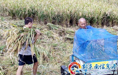 近日來,錦屏縣部分鄉鎮的水稻日漸成熟,留守老人成為稻子搶收主力軍,這些地方的學生娃利用雙休或放學后下田幫助老人搶收稻谷,真正體會到了糧食的來之不易,成為孩子們至孝至親的行動縮影。圖為9月8日,該縣鐘靈鄉高寨村的一歐姓老人與孫子正在搶收稻谷的情景。(錦屏縣鐘靈鄉教育輔導站 李斌)