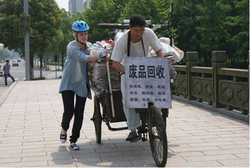 他穿一件普通白T恤,脖上掛一塊“廢品回收”的木板,腳蹬一輛裝滿廢品的三輪車。路人好奇的看著,一個是汗流浹背,收著破爛;一個是金發少女,面容姣好,一身運動裝扮,卻在賣力幫收破爛的推著車,二人還不時地停下來輕聲交談。怪異的景象,有人搖搖頭就走了,也有人若有所思,他們是不是在拍戲哦。看這二人裝扮差別太大,必是什么特殊經歷才能有今天這一幕吧,他們以后會怎么樣呢?