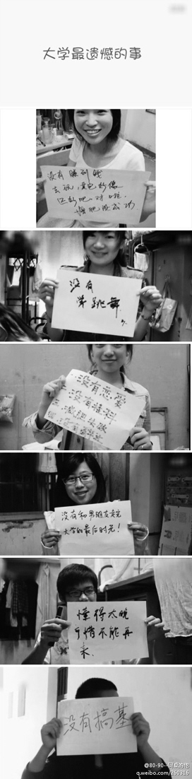 臨近畢業,畢業生們通常會以各種形式來紀念即將逝去的大學生活,如拍畢業照、聚餐、寫畢業留言等。但今年又多了一種形式,那就是“曬遺憾”:“我最喜歡的女孩,卻沒有追到手”“沒有談戀愛”“想出去旅游,但不是沒有時間就是沒有錢”“沒有好好學習、天天向上”……當一個個即將畢業的大學生舉著寫著“遺憾”的白紙站在鏡頭前,無聲地訴說自己的“遺憾”時,無論你是不是一名即將畢業的學生,都很難不為之動容。