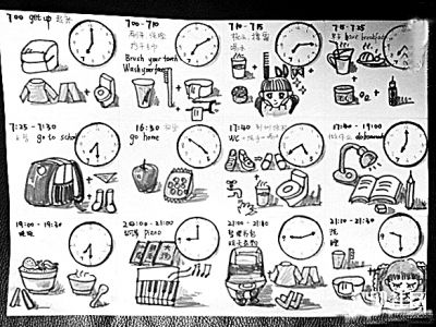 李女士是美院畢業,因此有不錯的繪畫功底,她選取了女兒一天作息時間來繪制。如早晨7點起床,有時鐘指示,還有杯子衣服和小馬桶等畫面,10分鐘刷牙洗臉,10分鐘吃早餐……每一個作息項目,她都細心地繪制了女兒熟悉的場景,如臺燈、書包、電視機等……每一個旁邊都有一個手繪的時鐘指示時間。