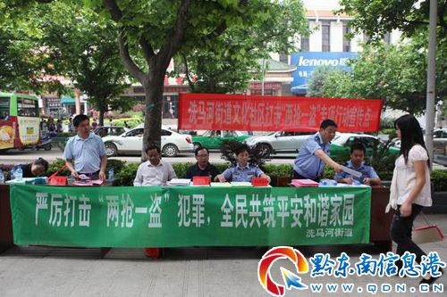 5月20日(星期日)上午10時(shí)許,洗馬河派出所所長(zhǎng)王軍帶領(lǐng)派出所民警在狀元府門前懸掛橫幅,在人行道擺放宣傳活動(dòng)展板,與洗馬河文化社區(qū)聯(lián)合開展打擊“兩搶一盜”宣傳活動(dòng)。洗馬河街道政法委書記潘成才同志、綜治辦主任潘秋生同志、文化社區(qū)書記張興同志來到宣傳活動(dòng)現(xiàn)場(chǎng),向群眾發(fā)放宣傳資料。