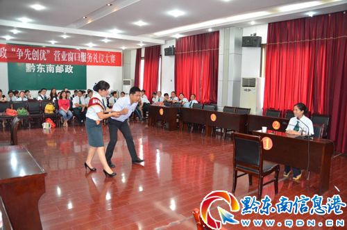 為加強黔東南郵政企業文化建設,進一步提升郵政營業窗口服務質量,2012年6月28日,黔東南州郵政局舉辦了“創先爭優”營業窗口服務禮儀大賽。本次禮儀大賽是對全州郵政營業窗口服務的一次大檢閱,是對郵政窗口工作的一次大展示,來自全州16個縣(市)48名選手參加了大賽。