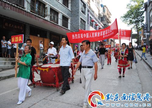 7月31日,黎平縣紅色文化團從黎平會議會址出發(fā),拉著橫幅,敲鑼打鼓,對駐黎軍隊、消防、武警開展擁軍愛民慰問演出活動,迎接“八一”建軍節(jié)的到來。(周志光)