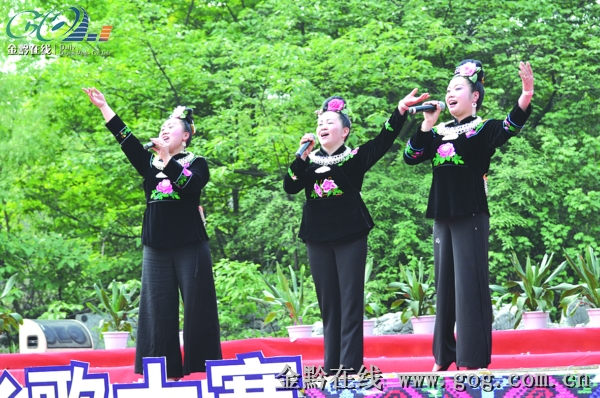 據悉,參加本次大賽的總計有12支代表隊18名苗族歌手參加,他們分別來自四川省興文縣、珙縣、古藺縣、敘永縣、筠連縣,云南省鹽津縣以及我省黔西縣等。圖為雷山三姐妹登臺領獎和現場激情演唱。