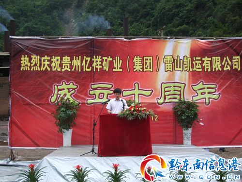 2012年5月30日,雷山縣重點規上企業貴州億祥礦業(集團)雷山凱運有限公司在望豐鄉豐塘工業園區隆重舉行成立“十周年慶典”活動。中共雷山縣委副書記、縣長袁剛,縣政協副主席李玉文出席,并分別致辭和講話。