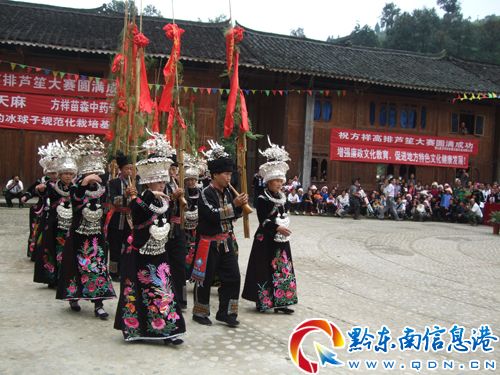 8月24日,貴州省雷山縣方祥鄉舉辦“方祥鄉首屆高排蘆笙大賽暨非遺文化傳承匯演”在平祥村蘆笙場隆重舉行。來自該鄉7個村寨、郎德上寨、南猛、大塘掌批、以及榕江縣小丹江、劍河縣太擁等19支代表隊共480多人參加了比賽活動。全國政協常委、原貴州省政協副主席吳嘉甫和省政協、省文化廳、省文物局等領導出席開幕式,吳嘉甫宣布開幕式,中共雷山縣委副書記、縣人民政府縣長袁剛作重要講話。