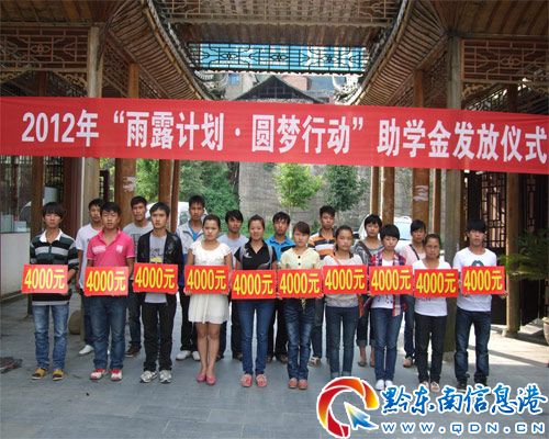 9月4日,雷山縣舉行2012年“雨露計劃-圓夢行動”助學金發放儀式縣扶貧辦園壩舉行,向30名新錄取大學的貧困生發放助學金共12萬元(每人4000元),使他們圓了“大學夢”。(張希才 李永剛)