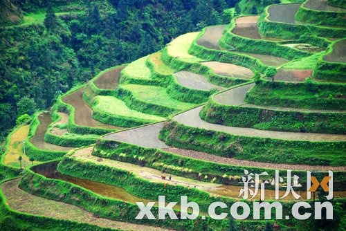 5月7日在貴州省黔東南苗族侗族自治州錦屏縣境內拍攝的梯田美景。時值立夏時節,位于貴州省錦屏縣大山深處固本鄉苗莊與宰格苗寨交界處的梯田蓄水充盈,層層疊疊,宛如玉帶,美不勝收。新華社發(楊文斌 攝)
