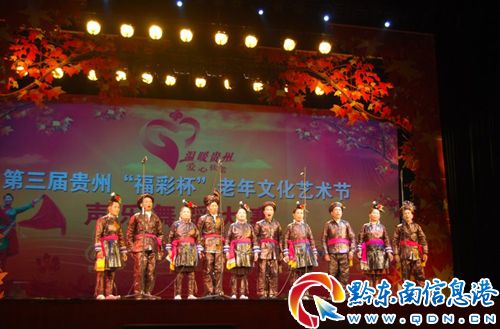 為豐富廣大老年人的精神文化生活,為老年人營造“樂”字當頭、健康幸福的環境,充分展示我省絢麗多彩的民族文化和老年人煥發向上的精神風貌。由貴州省民政廳、貴州省老齡工作委員會辦公室主辦以“關愛老人,共建和諧”為宗旨的第三屆貴州“福彩杯”老年文化藝術節聲樂舞蹈大賽于2012年10月16-17日在貴陽如期舉辦。在為期兩天的比賽活動中,全省各地、州 (市)老齡辦、省直機關工委、省工業信息委和省軍區等12支代表隊參加,共37個節目、近400人老年人參加了比賽活動。經過評選,分別角逐出獨唱、重唱和舞蹈3個類別的金銀銅和優秀獎。從江縣高增村老年協會演唱的《天地人間充滿愛》以9.947分的最高得分獲重唱組金獎,岑鞏縣選獎的《送軍鞋》獲舞蹈組銅獎。省人大常委會副主任周忠良,省人大常委會原副主任楊序順、楊光林,省民政廳紀檢組長鐘海洋,省民政廳黨組成員、省老齡辦專職副主任唐映祥等領導同志在頒獎儀式上為獲獎節目頒獎。