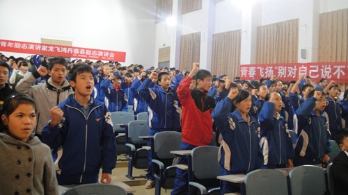 龍飛鴻以自身失去親人,身殘志堅的經歷引導學生要學會感恩,第二中學400余名學生和縣福利院的20余名孤兒無不為之動容。丹寨縣的學生大部分是留守兒童,他們思念親人的心在龍飛鴻先生抑揚頓挫的演講中尋求到了共鳴,得到了慰藉。在座師生紛紛落淚,更不少學生主動為身邊的老師抹去眼角的淚水,而龍飛鴻先生也忍不住淚流滿面。