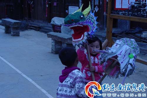 日前,筆者在隆里古城文化廣場看到,有一小對五歲左右的童男童女正在廣場上舞著龍頭,龍技可以與隆里古城成年的舞龍隊相比高低。一位年過古稀的老大娘告訴筆者,這兩個小孩是她家的外孫,看到大人在舞龍,他(她)個小孩也拿原來他爺爺編的小龍頭跟著舞龍隊走街串巷學著舞,前段時間小龍頭舞爛了,天天在纏著我重新買新龍頭。前段時間我剛從隆里古城編龍老藝人王先吉那里花了200元錢買過來兩個小龍頭,現在他(她)兩個只要天氣好就出來舞小龍。