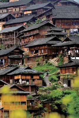 大小寨子,順坡而居,層層疊疊,屋脊鱗次櫛比,十分壯美。修建吊腳木樓是十分講究的,有修成四角天井式或三方聯立式,自成天井口格,頗見大氣。一般的吊腳木樓,有四排三間或五排四間,各間寬敞,人居舒適。畜棚禽舍,一般都設在房側或房后,也有用樓腳圍棚立圈作飼養畜禽,既方便管理,又干凈衛生。有的人家還在房后房邊建起一小棟專門囤裝糧食的谷倉,有的利用吊腳木樓邊搭架木板作曬場,白天曬些谷物或蔬菜,晚間還可納涼休息。
