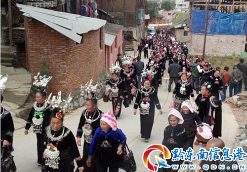 12月6日中午,120名雷山籍苗寨姑娘身著苗寨盛裝、便裝,抬著魚、鴨、酒、糯米飯以及糖果等禮品從雷山縣城北門向該縣丹江鎮黨高村走來。當地男女老少在寨門設12道攔門酒迎接她們回娘家參加苗年鼓藏節蘆笙盛會。