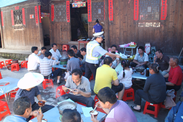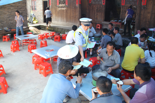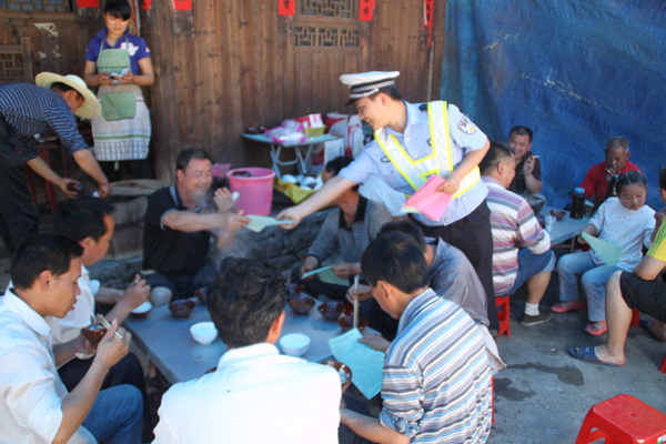 民警向辦喜事的群眾打招呼,講解酒后開(kāi)車的危害。