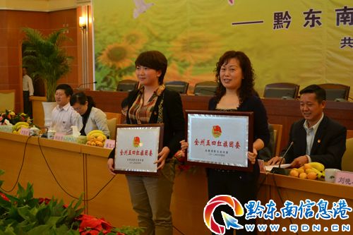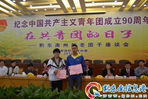會上,州委副書記楊華昌、州人大常委會副主任石干昌為榮獲2011年全州“五四紅旗團委”代表:州建總公司團委、麻江縣宣威鎮團委頒獎;州人大常委會副主任潘玉鳳、州人民政府副州長劉曉春為榮獲2011年度全州“五四紅旗團支部”代表:丹寨縣龍泉鎮卡拉村團支部、從江縣呵護地球環保志愿者協會團支部頒獎;州政協副主席楊勝勇、凱里學院院長曾羽為榮獲2011年度全州優秀團干部代表:黔東南州民族職業技術學院護理系團總支書記高媛、施秉縣甘溪鄉團委書記武芳芳頒獎;原團州委書記何蔓麗、原團州委副書記任家洪為榮獲2011年度全州優秀共青團員代表:凱里學院學生會主席、09級文秘一班馬超、凱里市第三中學高二(2)班羅學嬌頒獎。