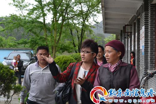 黔東南著名原創音樂歌手吳勝利向張馨元介紹坦洞小學學生學習環境現場