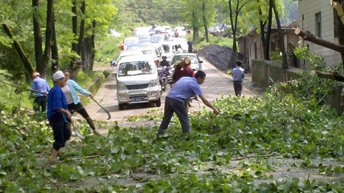 4月30日,貴州省黃平公路管理段職工在省道204線159公里處清理被大風連根拔倒的行道樹。