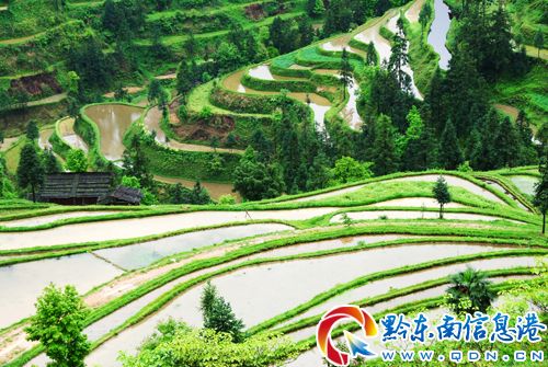 時值夏初時節,位于錦屏縣固本鄉苗莊與宰格苗寨交界處的梯田蓄水充盈,層層疊疊,宛如玉帶,霧嵐縹緲,美若仙境。