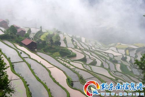 時(shí)值夏初時(shí)節(jié),位于錦屏縣固本鄉(xiāng)苗莊與宰格苗寨交界處的梯田蓄水充盈,層層疊疊,宛如玉帶,霧嵐縹緲,美若仙境。