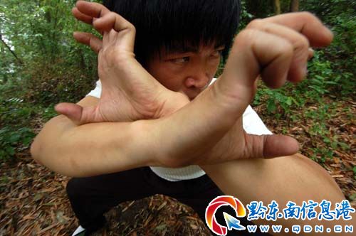21日,在黔東南州凱里市大風洞鄉桐油坪村后山上的竹林中,苗族小伙王飛鴻興致昂然地表演他的看家本領――苗家功夫之“苗家四門開”。其七旬老母親坐在一旁津津有味觀賞著兒子的表演,眼里透出了一絲欣慰與滿足。王飛鴻說,苗家功夫以前都是家族祖傳,可他表演的這套拳術在任何場合都施展,不分場地大小,不分屋里屋外,什么道具都可用使用,隨手撿的一根棍子,家中的桌子、凳子,甚至桌子上的碗與筷子都可用來當武器施展。