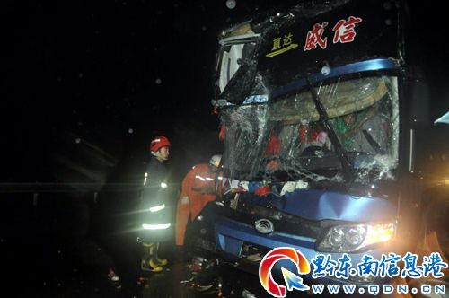 事發后,高速交警迅速趕赴現場救援和調查,因大巴車上的40多名乘客被困車內,交警部門便向三穗縣消防大隊求助。