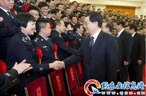圖為胡錦濤總書記等中央領導人接見受表彰民警的場面
