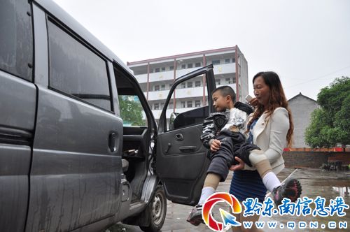 班主任龍翠菊抱羅森上車回家。