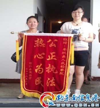 “感謝岑鞏檢察官……”,6月14日上午9時許,一名中年婦女手里拿著一面旌旗,熱淚盈眶地握著公訴科檢察官的雙手,感謝檢察官們匡扶正義,為她挽回了經濟損失。這一幕發生在岑鞏縣人民檢察院內。檢察官接過旌旗,上面赫然寫著金光閃閃八個大字:“公正執法,熱心為民”。