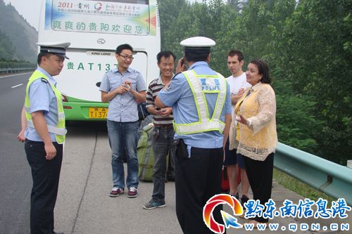 臨走之時,一名外國友人拉著民警的手,很激動地說了一連串感激的話:非常感謝你們的幫助,中國警察是如此的可愛且友善,這是一個美妙和難忘的旅程,希望將來能再次來到凱里!(圖為高速警察幫助老外的情景)(宋慶文 羅茜攝)