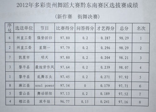 2012多彩貴州黔東南賽區選拔賽街舞決賽成績如下:
