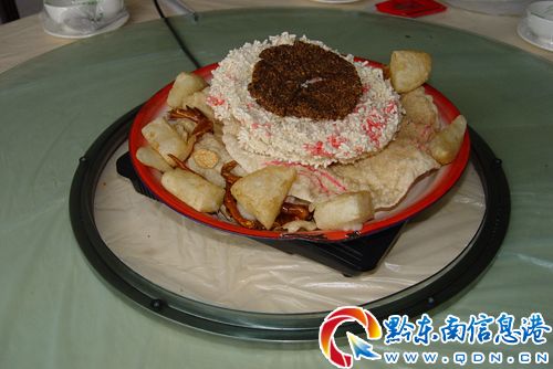 菜粑粑制作以秈米糯米各半,以生姜、韭菜、蔥、蒜、少量辣椒粉、五香粉、米酒等佐料,攪勻放鹽,蒸煮成糯米飯,然后做成15-20厘米大,厚約1厘米的圓餅,曬干或烘干以備用。待客人來時,用菜油炸酥后用刀切成小三角塊,與米花、麻葉一起上桌招待賓朋。其味香、酥、脆,食用者越吃越想吃。近年來, 米花、麻葉、菜粑粑成為隆里古城接待游客佳品;中外游客到隆里古城旅游大多數(shù)都要帶上米花、麻葉、菜粑粑返回家鄉(xiāng)供親戚朋友品嘗。(石福濤)