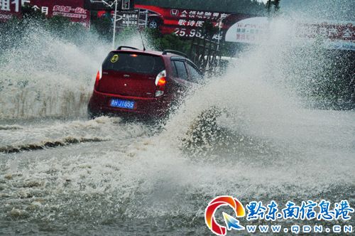 此外,凱里市區多條道路被水淹。其中凱開大道西出口路段一低洼處洪水將20多米長的路段完全淹沒,車輛路過,水花亂濺,十分壯觀。