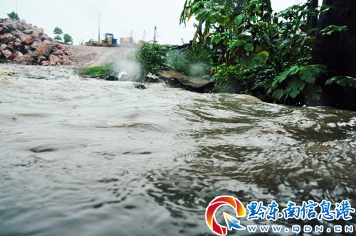 7月15日,凱里地區連續降大雨,凱開大道化肥廠路口處下方因排水通道狹小,造成洪水外溢,漫過路面,沖入了路邊的一家工廠和民宅,所幸工廠內設置有排水通道,未造成嚴重災害。