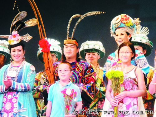 美國(guó)中部時(shí)間七月二十七日晚,大型民族歌舞《多彩貴州風(fēng)》在芝加哥舉行二〇一二年美國(guó)首演結(jié)束后,華人少年情不自禁登上舞臺(tái),與演員合影,并獻(xiàn)花。