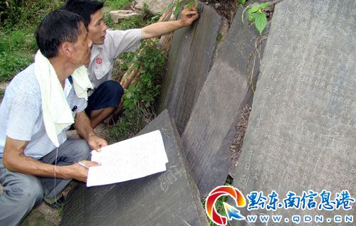 據當地老人介紹,該寨于明洪武二年創立(歐漢龍墓碑有記載),自今已有600多年歷史,在嘉慶五年(1801年),全寨百姓捐銀出力,把整個村寨的大街小巷全部用青石板鋪就,大街長1000余米,寬近2米左右,小巷總長5000余米,寬1米左右。當時的民房全部把大街小巷遮擋得嚴嚴實實,滴水不漏,即使天下暴雨,村民走街串戶,可穿布鞋,不戴雨具。后因遭遇兩次寨火,房屋被燒,青石路被損,F存的大街小巷青石路面完好率在60%以上,是原生態環保村寨步道最具研究價值的活化石,也是鄉村旅游及攝影愛好者不可多得的一處原生態景點。圖為近日,考古愛好者正在查看碑文。(李斌)