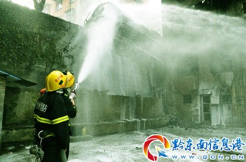 事故發生后,正在市區執勤的凱里消防特勤官兵立即趕赴現場處置。情況十分危險,一方面,火情嚴重,而且燃燒面在擴大;另一方面,罐車內還有大量的油料,一旦車體過度受熱,情況就會非常危險。這樣的情況光靠水槍是解決不了問題的,鑒于此,凱里市消防大隊立即派出高噴車前來支援,高噴車裝載的是滅火泡沫,對燃油火災有極好的“療效”。