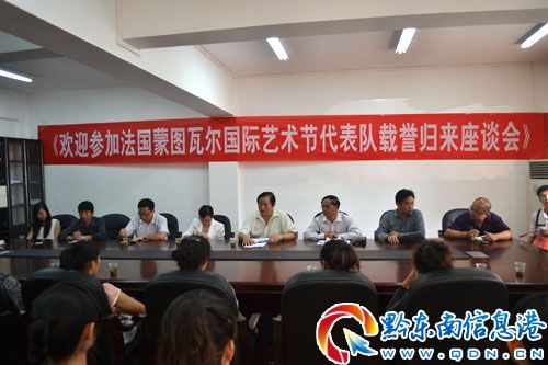 8月23日,國家文化部、省文化廳、州委、州政府、主管局委派黔東南州民族歌舞團代表中國參加法國蒙圖瓦爾國際藝術節(法國COIFF國際民族民間藝術節)代表團載譽歸來座談會在州文體廣電局會議室召開。