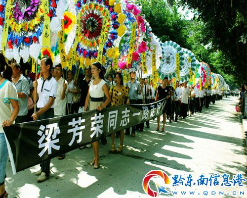 9月5日晚,貴州榕江縣樂里鎮信用社旁發生斗毆事件,該鎮派出所主持工作的副所長梁芳榮制止打斗,被歹徒捅殺7刀,英勇犧牲。9月8日,是梁芳榮下葬的日子,榕江縣城數萬群眾自發趕來送行,場面十分感人。