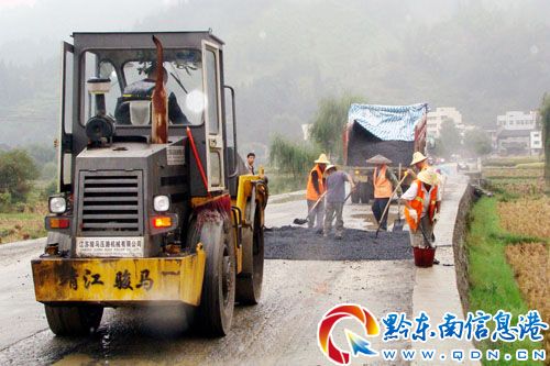 9月24日,黔東南天柱養路段的工人師傅們正在202省道錦屏縣境內鐘靈段檢修受損的柏油路面。當日,天下著小雨,護路使者們揮舞著手中的鐵產,開足馬力,干得熱火朝天,個個爭著為黨的“十八大”獻禮。(李斌)