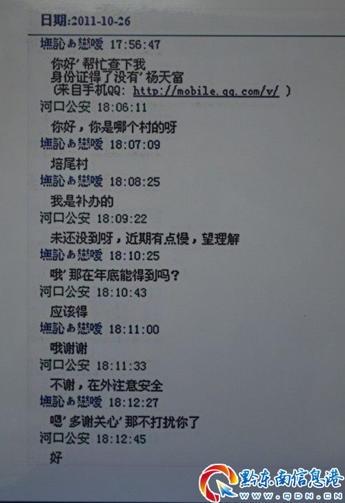 近日,河口鄉培尾村村民楊漢輝,因在廣東省東莞市一家皮具制造廠工作時,不慎將自己的第二代居民身份證丟失,給其工作和生活帶來了不便,沒有身份證的他進不了廠,只能打臨時工。之后,楊漢輝通過與家人聯系,從河口派出所發到村寨的警民聯系卡中獲知“QQ警務”和電話,并在線進行咨詢。河口派出所通過信息情況核實,通知楊漢輝把辦證的相片通過“QQ警務”傳到河口派出所進行第二代身份證補辦。喜訊傳來,楊漢輝激動不已,立即在當地辦理身份證件照并利用QQ傳至河口派出所“QQ警務”。