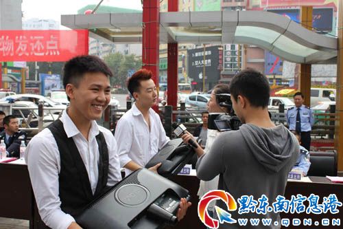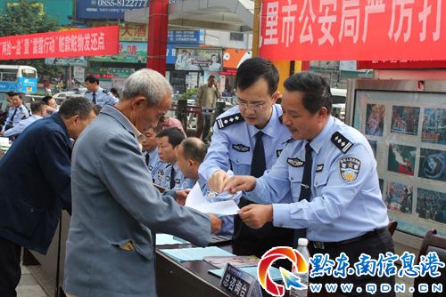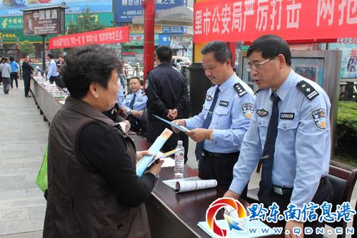 宣傳活動(dòng)中,州公安局副局長(zhǎng)、市公安局局長(zhǎng)楊天權(quán)同志率領(lǐng)市公安局黨委成員和各警種負(fù)責(zé)人主動(dòng)向過(guò)往的市民發(fā)放治安防范宣傳資料、解答群眾的咨詢。通過(guò)兩輛宣傳車在全市主要街道播報(bào)《凱里市人民政府在全市范圍內(nèi)開(kāi)展嚴(yán)厲打擊“兩搶一盜”等違法犯罪專項(xiàng)行動(dòng)的通告》、《凱里市公安局告全市人民群眾的一封公開(kāi)信》等宣傳內(nèi)容。并舉行了贓物發(fā)還儀式。