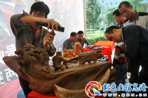 來自錦屏縣的楊坤是黔東南州著名的雕刻工匠,近日,他的雕刻作品《月亮山上的老阿爹》在凱里“出爐”,引發了轟動效應,到他工作室參觀的工匠和雕刻愛好者絡繹不絕,其中有幾位買主出資至少2萬元要將它買走,但遭到楊師傅的拒絕。