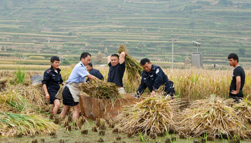 當民警們將收割好的稻谷抬到宋國忠老人家里時,老人家激動地說:要不是有你們公安民警幫助,我的稻谷還不知道怎么收割,可能今年的稻谷就要爛在田里了,謝謝你們,你們真是我們苗寨的好警察!(曾小科 陸永偉 何可騰 攝)