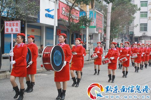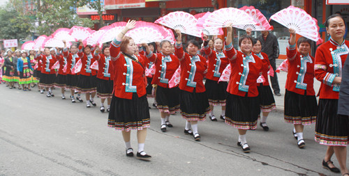 10月18日,身裝亮麗各健身舞代表隊在錦屏街上游行。當天,該縣在城關體委球場舉行“喜迎十八大”健身舞比賽,來自全縣各鄉鎮25支代表隊參加精彩激烈角逐,老年人舞蹈迎“十八大”,表達她們在改革開放以來錦屏貧困鄉村巨變下農村“老有所樂”幸福、快樂的精神文化生活。(姜巨標)