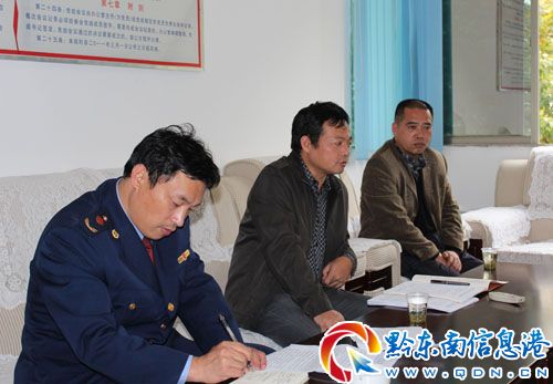 圖為雷山縣工商局黨組書記、局長隆曉明(左二)向委常委、紀委書記楊勝軍匯報工商行政管理工作