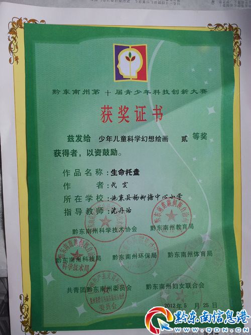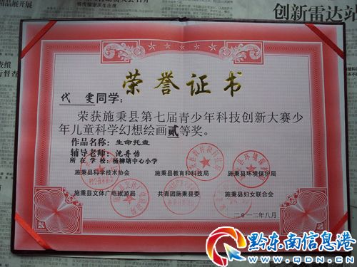 在由施秉縣科協、教育局、環保局、文體廣電旅游局、團縣委、婦聯共同舉辦的第七屆全縣青少年科技創新大賽組委會推薦參加貴州省第二十七屆青少年科技創新大賽中,施秉縣楊柳塘中心小學沈丹怡老師輔導該校學生楊雯同學創作的青少年兒童科學幻想繪畫作品——《生命的托盤》榮獲二等獎。該作品同時榮獲黔東南州第十屆青少年科技創新大賽二等獎,施秉城關二小楊敏老師輔導的青少年兒童科學幻想繪畫作品《未來云層雨轉換器》和《溫泉水回收利用裝置》榮獲三等獎。(施秉縣教育局 王世才)