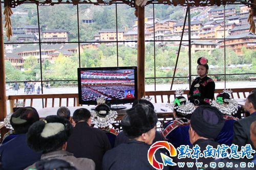 雷山西江千戶苗寨97%以上都是苗族,為了讓村民及時全面了解黨的十八大的會議精神,西江苗寨特別組織村民到寨中的風雨長廊集中收看十八大開幕式,在現場專門配備了一名苗語翻譯。