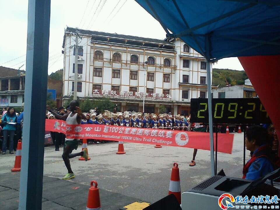 2012貴州環(huán)雷公山超100公里跑國際挑戰(zhàn)賽第二日,11時5分左右,凱里三棵樹鎮(zhèn)終點迎來了從雷山民族體育活動中心跑來的男子組前三名參賽選手們。