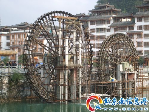 據悉,雷山縣投資1100多萬元,實施縣城臨街房屋立面民族特色外包裝工程,建成木鼓廣場河濱道大型水車兩座(水車直徑長達10-12米),完成了風雨橋、木鼓廣場長廊維修以及縣城景觀燈維修安裝和街道綠化工程,縣城美化亮化工程基本完成,將在苗年鼓藏節讓游客高興而來、滿意而歸。圖為木鼓廣場河濱道的兩座大型水車轉動的場面。(雷山縣委宣傳部 張希才)
